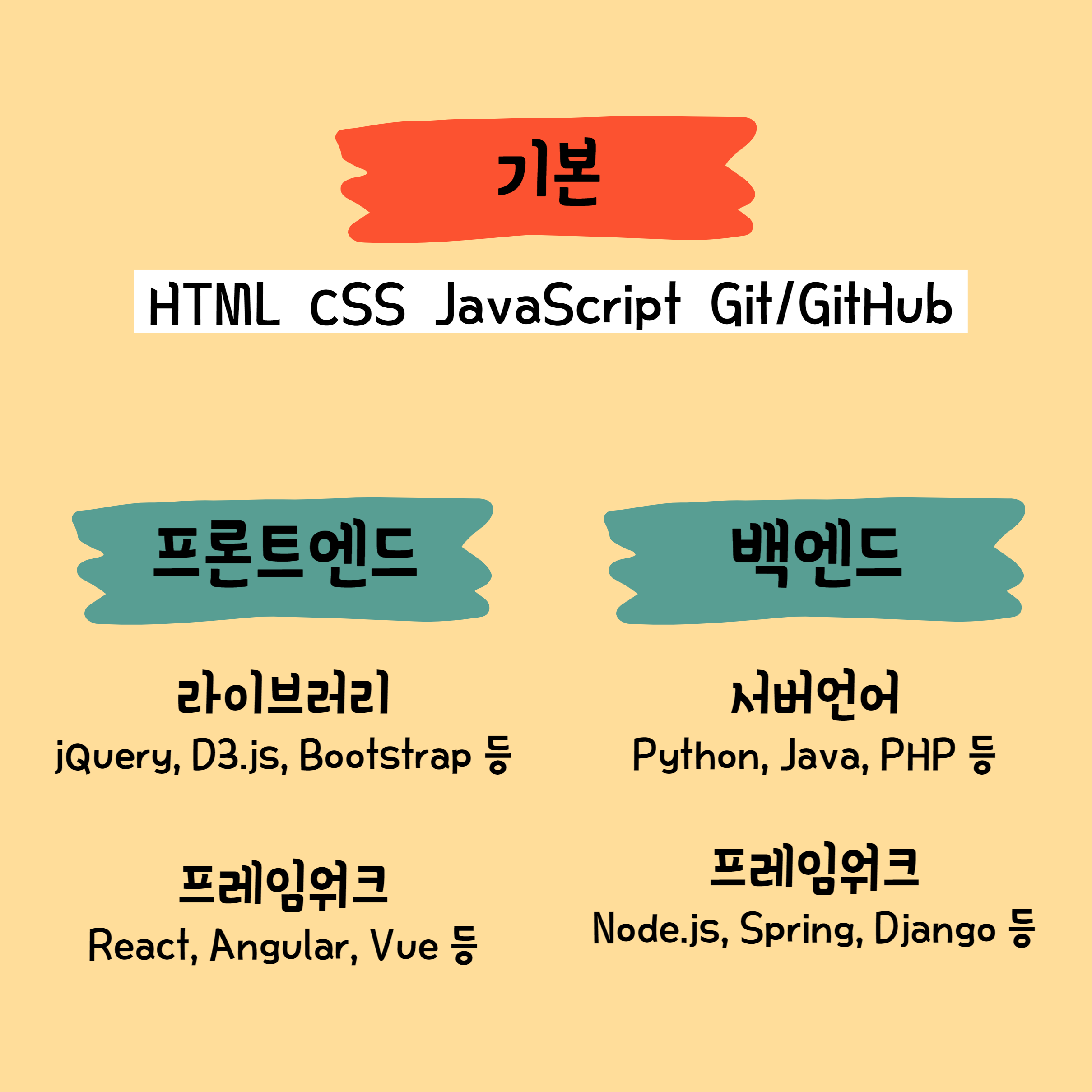 기본 영역은 프론트엔드와 백엔드 개발을 위해서는 반드시 알아두어야하는 기술입니다. (앞선 포스팅에서는 HTML, CSS, JavaScript를 프론트엔드 개발언어로 소개했지만 백엔드 개발자도 알아야 하는 언어입니다.) 기본을 익힌 후 자신의 개발 분야에 따라 프론트엔드나 백엔드의 언어와 기술을 선택해 공부해야 합니다.