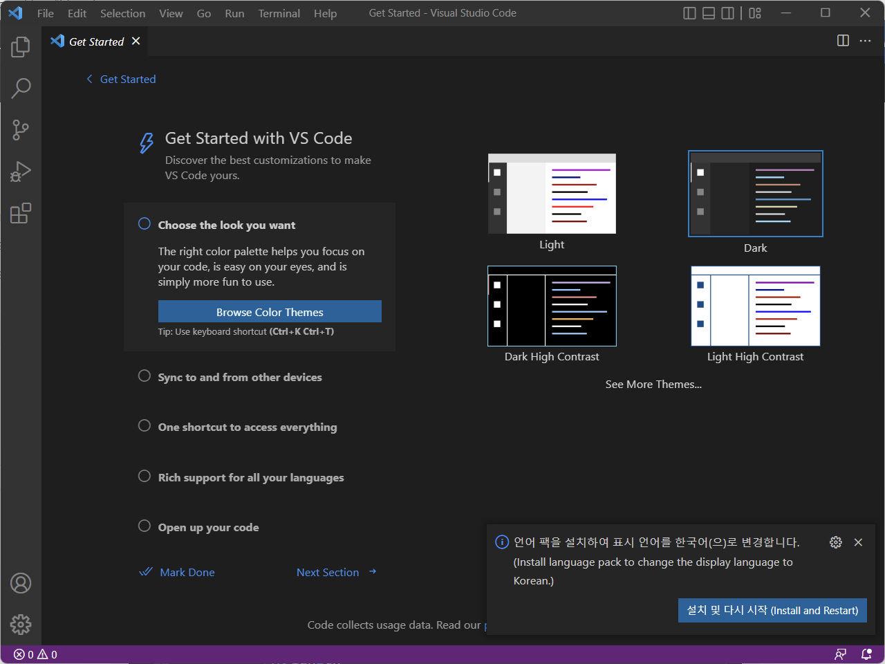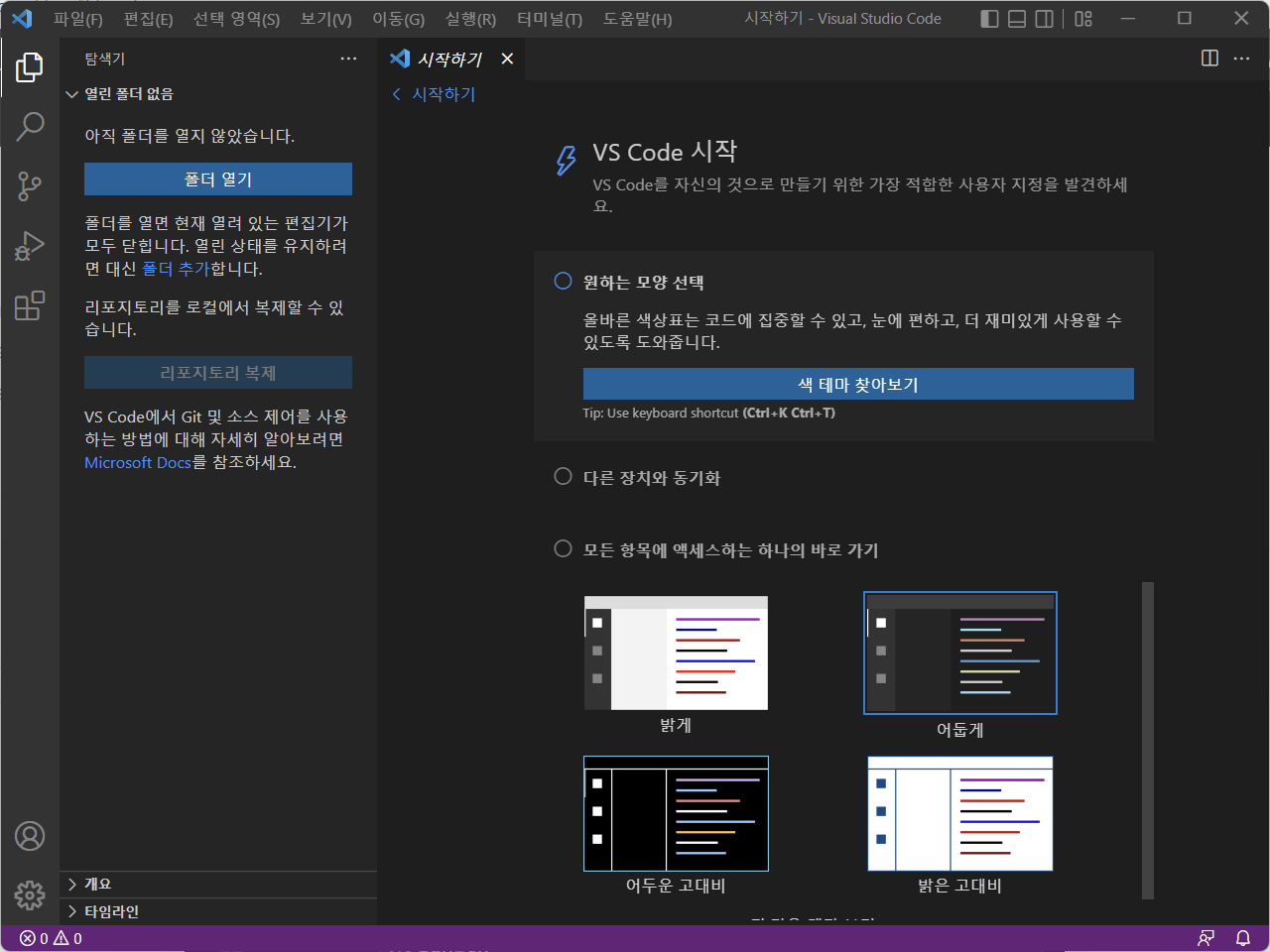 - 비주얼 스튜디오 코드가 재시작되면 한글로 언어가 변경됨