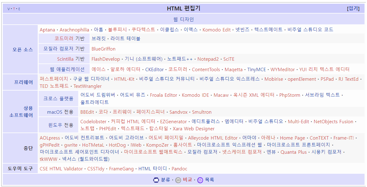 - 종류 : 윈도우용(Notepad++, 에디트 플러스 등), macOS용(Textmate, Coda 등), 윈도우와 macOS모두(Visual Studio Code 등)