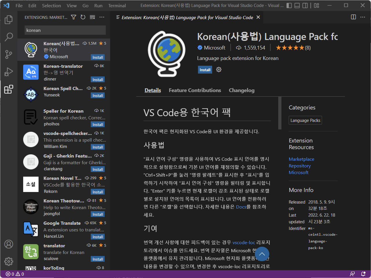 - 'Korean(사용법) Langage Pack for Visual Studio Code' 클릭
