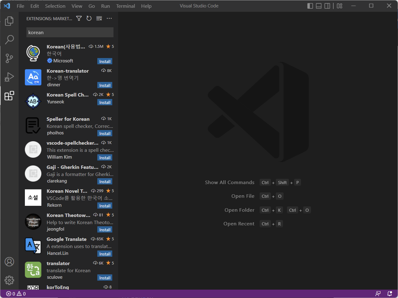- 검색창에 'korean'을 입력